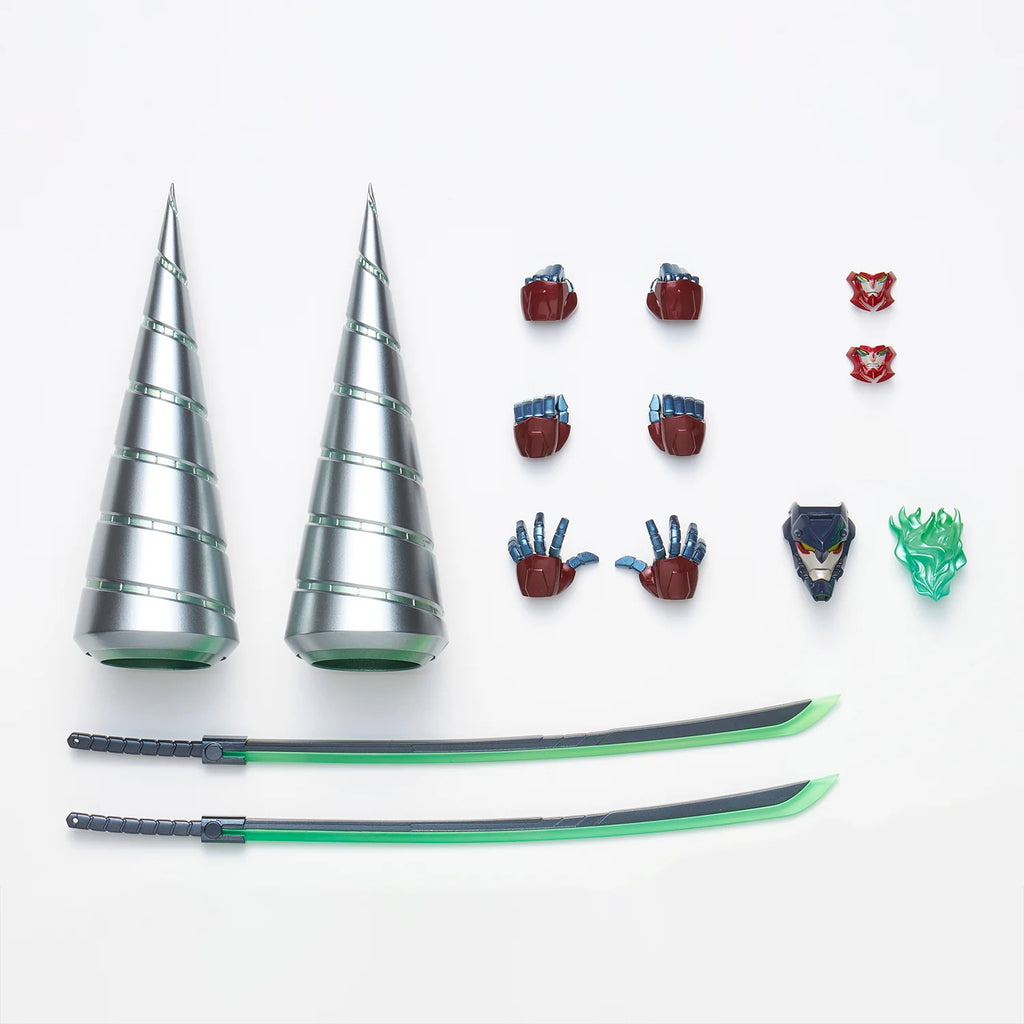 Standing appx 10" tall (14" with flame effects), the figure includes 2 optional sets of hands and a face part. Also included are Giga Drill and Enki Sword that can be equipped to both arms!