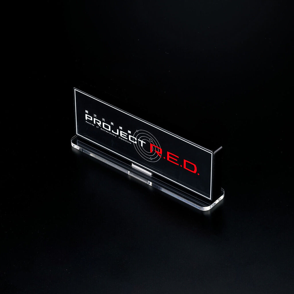Simple display featuring the Project RED logo -- perfect for displaying alongside action figures, mecha, minipla and other toys from the various series under the Project R.E.D. umbrella.